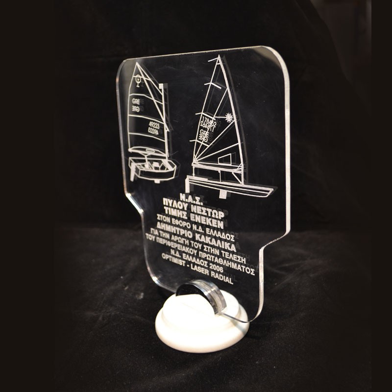 Βραβείο από plexiglass χαραγμένο & κομμένο με Laser, σε μαρμάρινη βάση.