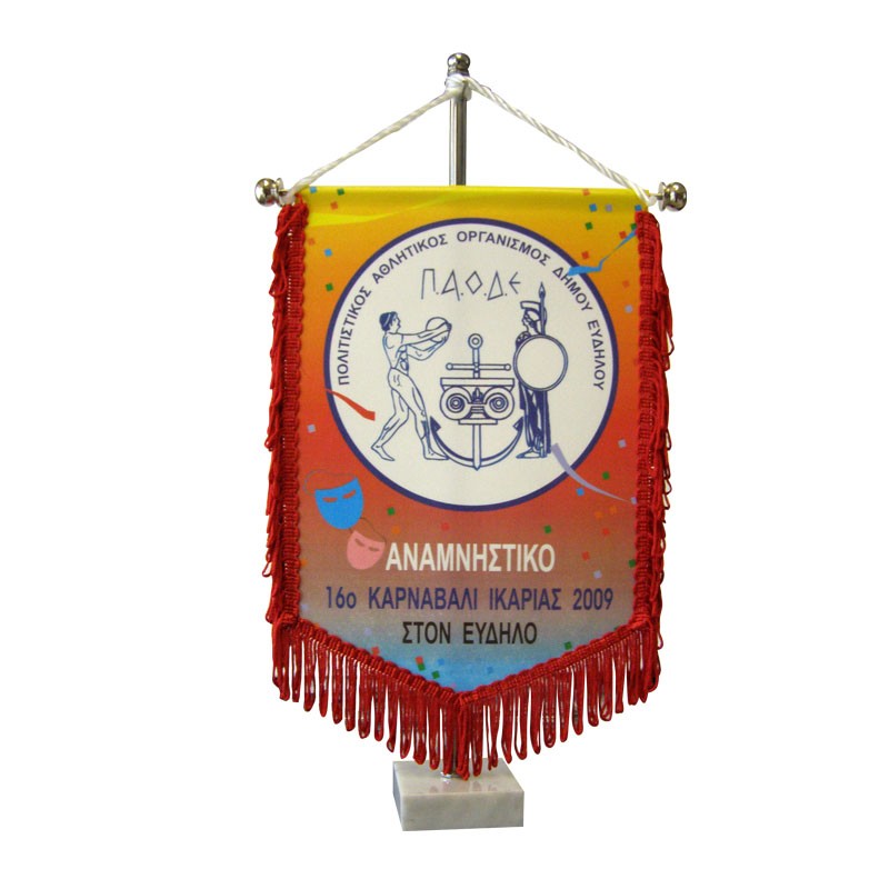 Λάβαρο διαστάσεων 20x30 cm από σατέν Γερμανίας ενισχυμένο , τυπωμένο με ψηφιακή αμετάβλητη εκτύπωση στη μια όψη, με τις δυο πλευρές κολλημένες μεταξύ τους και κομμένες με laser για να μην ξεφτίζουν, μονοκόμματο ύφασμα μπρος και πίσω ,με μεταλλικό μασίφ μπρούτζινο στήριγμα χρωμιωμένο και παχύ κρόσσι ραμμένο περιμετρικά του λαβάρου.